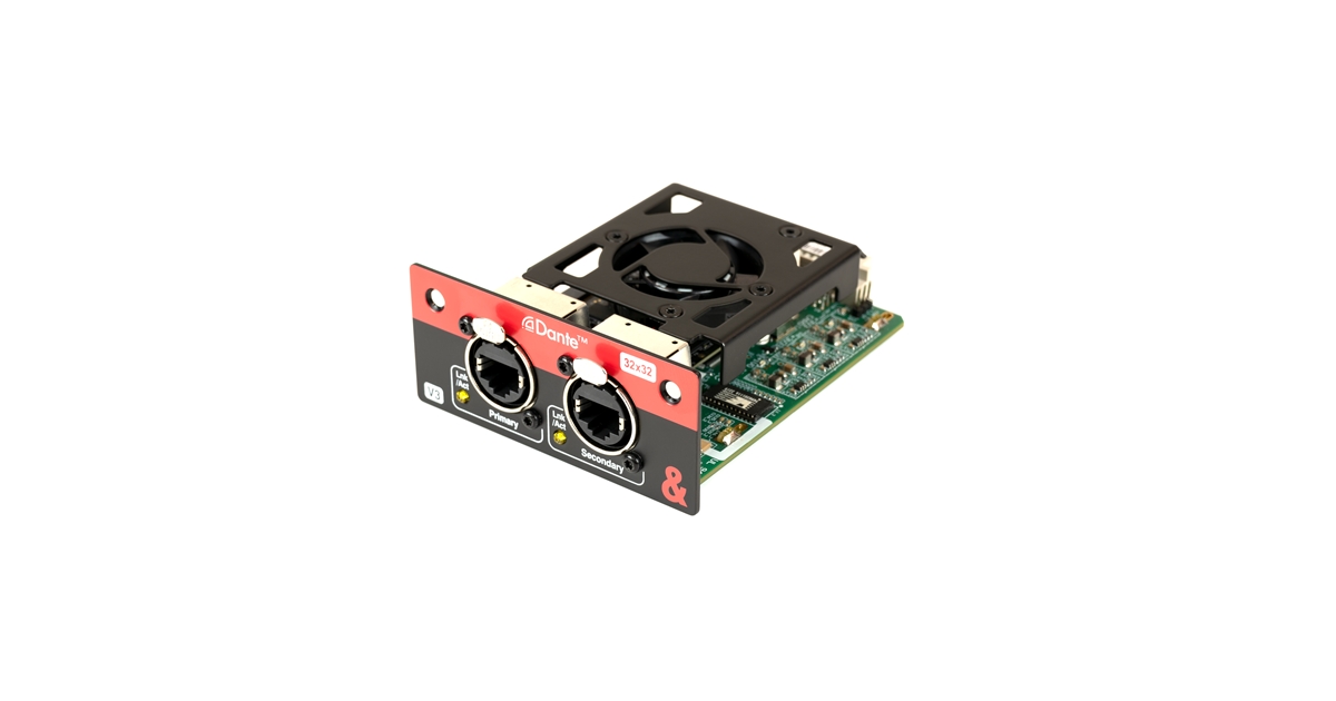 Scheda Dante per mixer SQ e AHM con 32×32 canali a 96kHz (o 48kHz), ridondanza, clock master e compatibilità Dante Controller.
