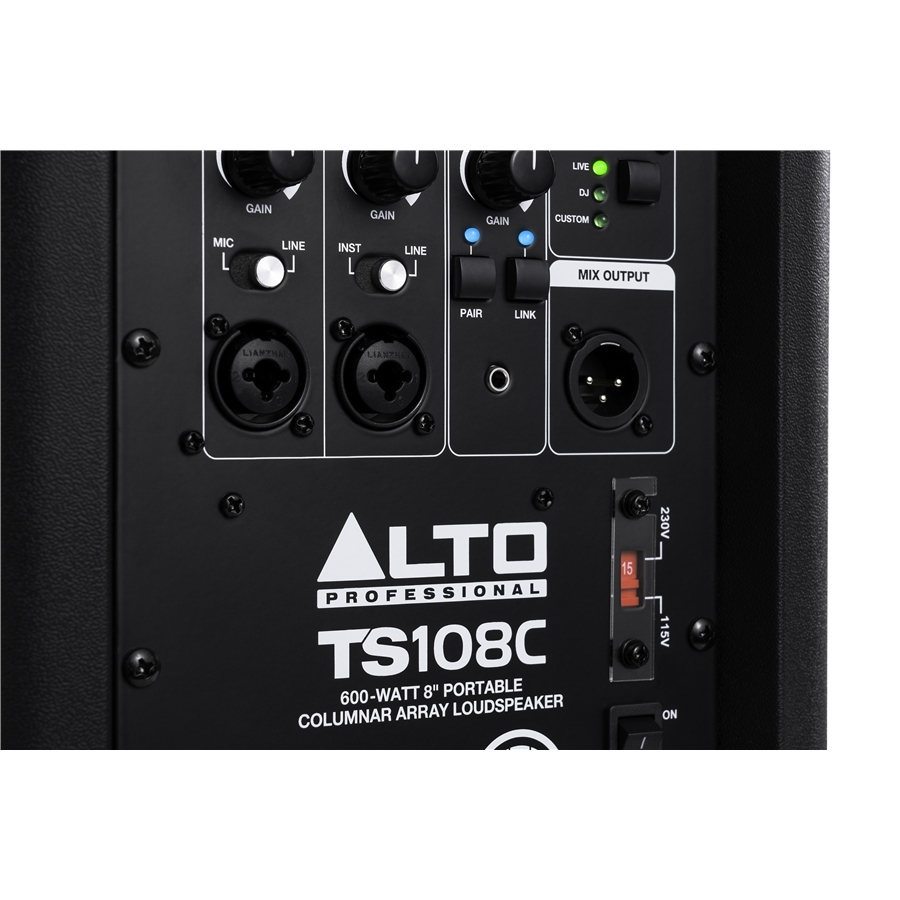 Le 4 modalità DSP dedicate (Normal, Live, DJ e Custom) permettono di adattare il profilo sonoro di questo diffusore a colonna amplificato a ogni stile musicale e situazione live mediante la semplice pressione di un tasto. Che si tratti di un set acustico in un bar, una lezione di fitness o un DJ set per 200 ospiti, la colonnina amplificata Alto Pro TS108C garantisce impostazioni rapide e intuitive grazie ai controlli del mixer integrati nel pannello posteriore e configurabili via Bluetooth attraverso l’Alto Pro App.
