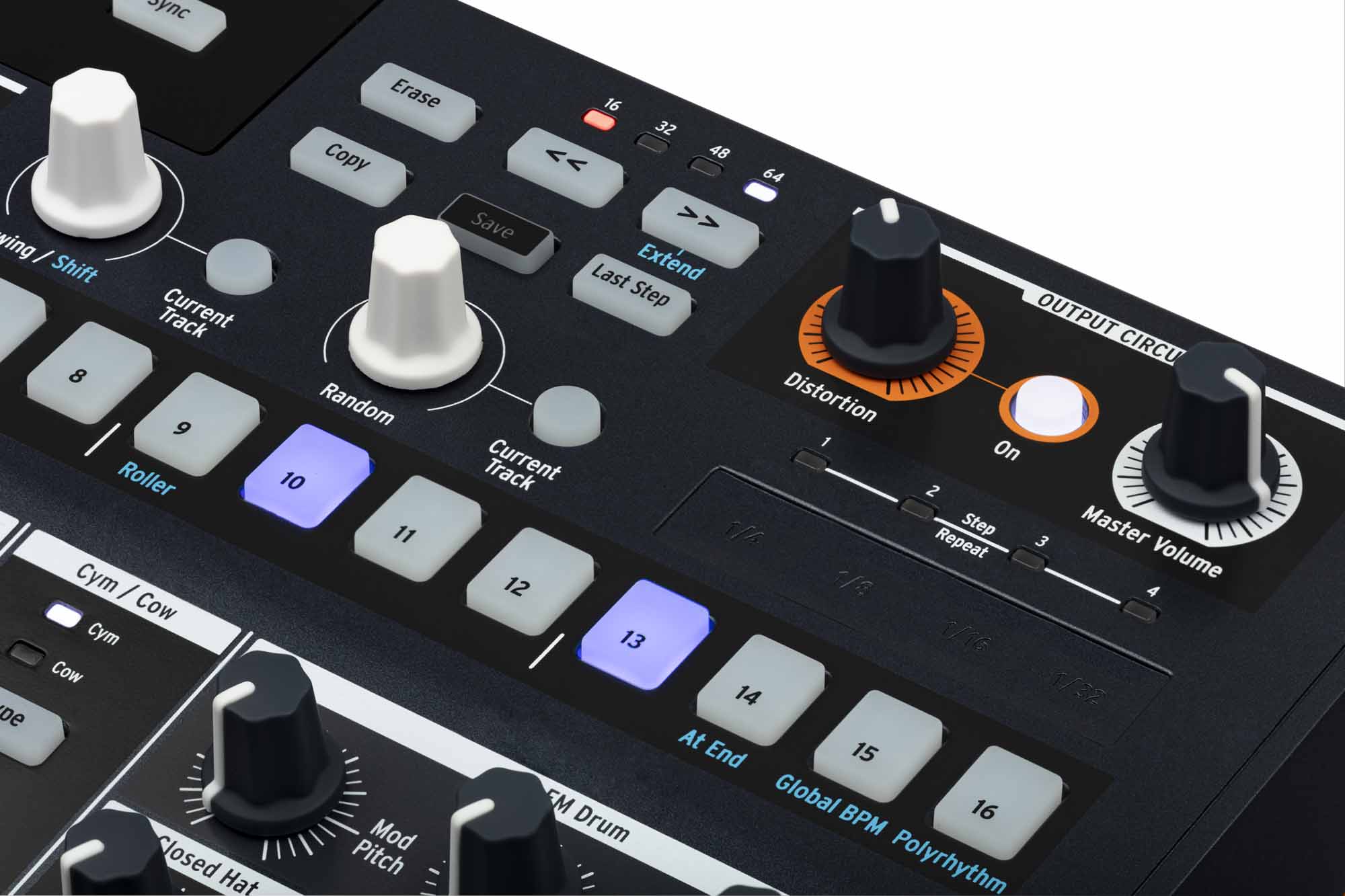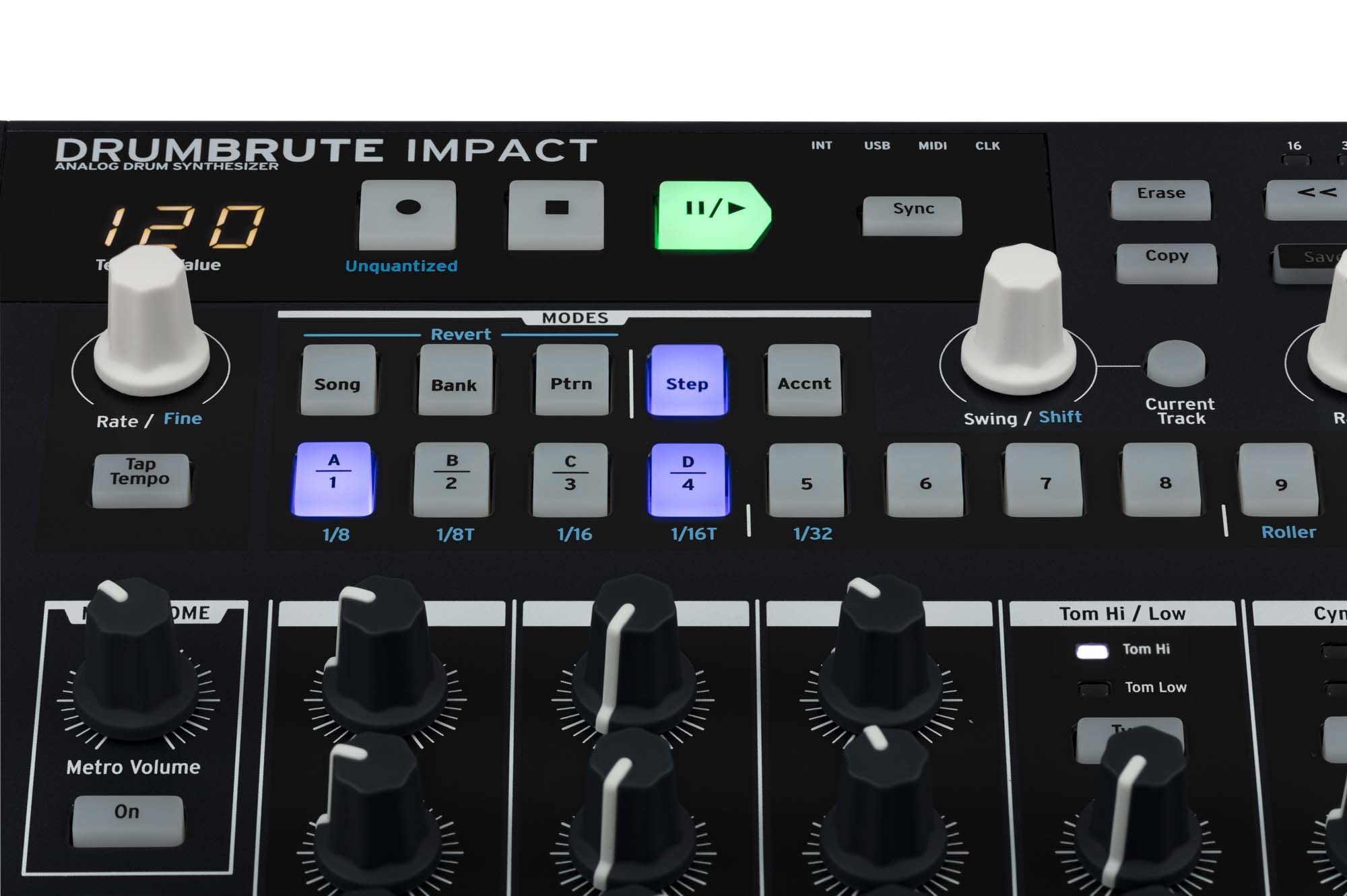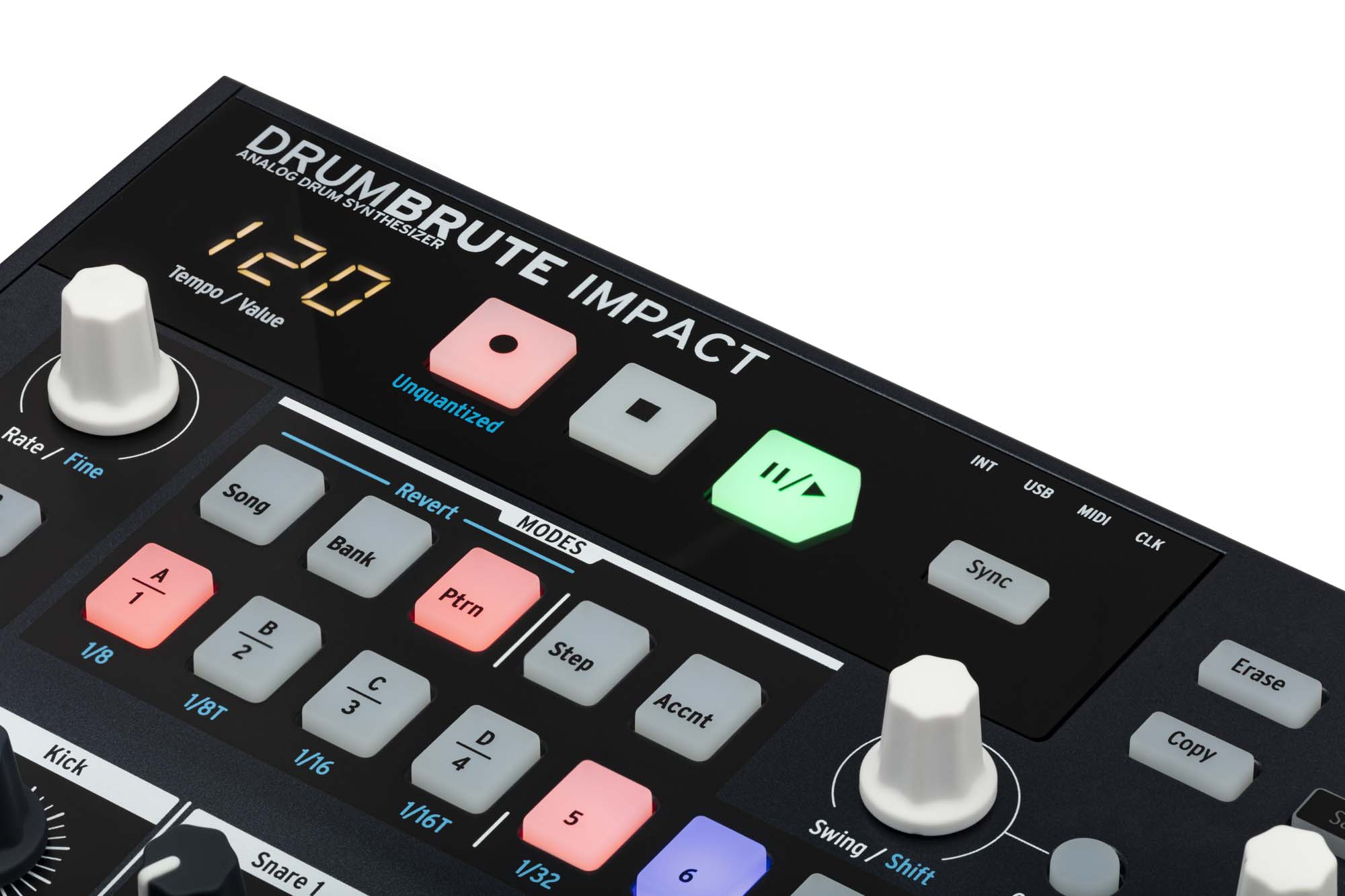 Il sequencer di DrumBrute Impact è progettato per essere immediato ma estremamente flessibile. Ogni pattern può arrivare fino a 64 step, con la possibilità di impostare lunghezze indipendenti per ciascuno strumento, permettendo la creazione di poliritmie e polimetri complessi. Le funzioni Roller e Looper consentono interventi performativi in tempo reale, mentre Random e Swing introducono variazioni ritmiche controllate, utili per evitare pattern statici e ripetitivi.