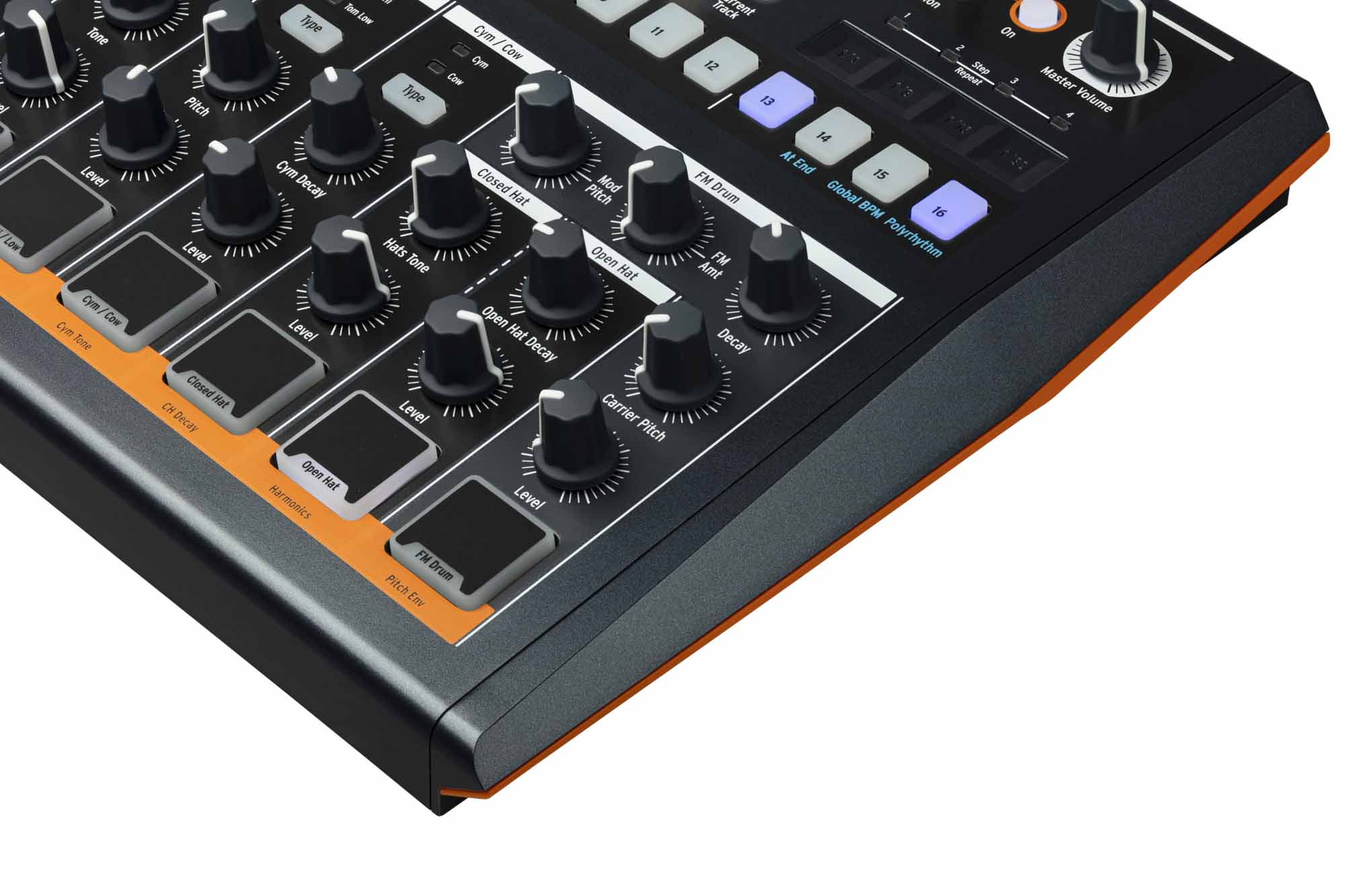 La funzione Color rappresenta uno degli elementi distintivi di DrumBrute Impact. Attivabile per strumento o per singolo step, Color introduce variazioni timbriche specifiche come overdrive sul kick, snap e crack sullo snare, o aural exciter su hi-hat e tom. Questa funzione consente di creare pattern dinamici e articolati senza ricorrere a automazioni esterne. A completare la sezione sonora è presente una distorsione analogica sull’uscita master, ottimizzata per la batteria, che permette di aggiungere saturazione e carattere mantenendo il controllo sull’impatto complessivo.