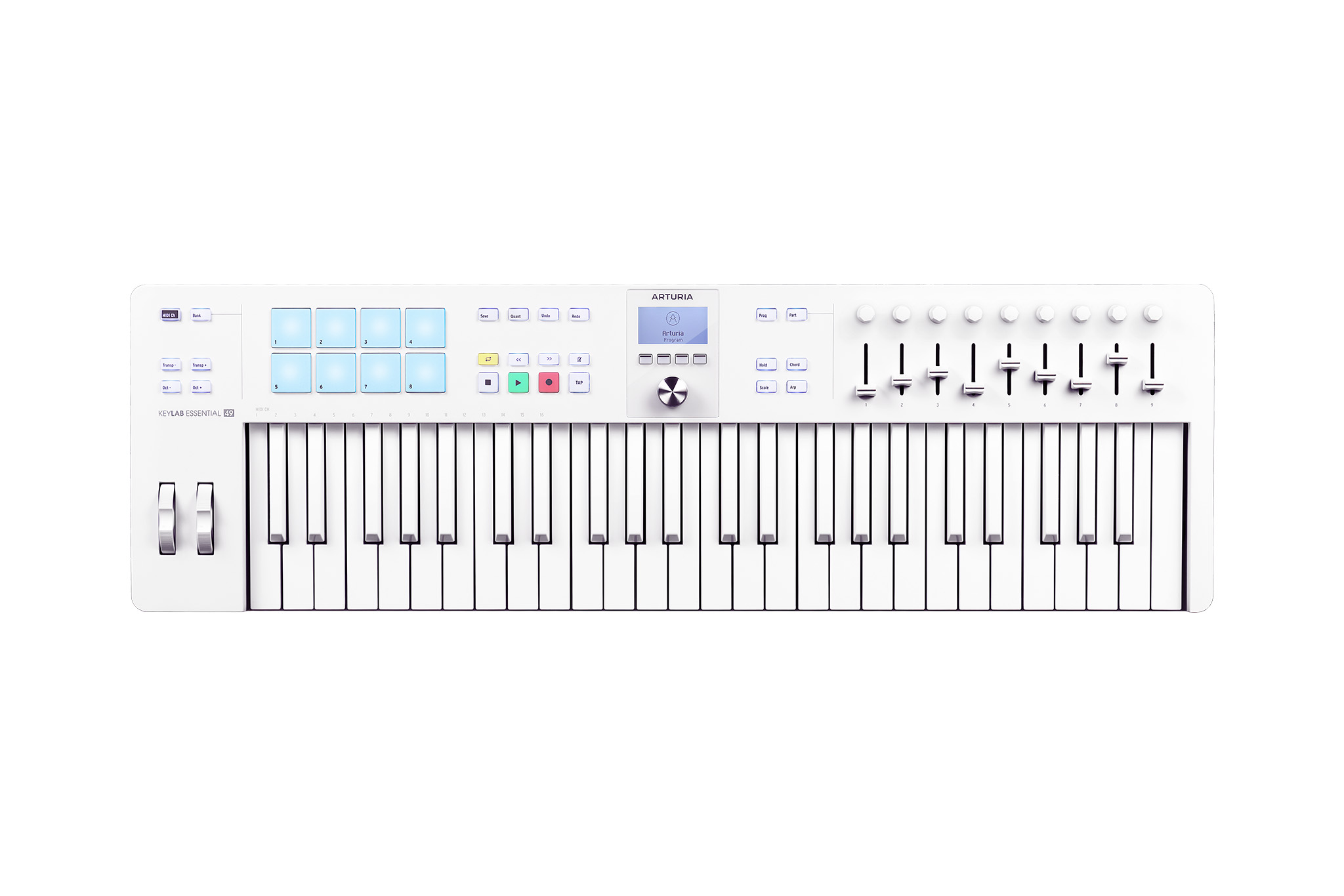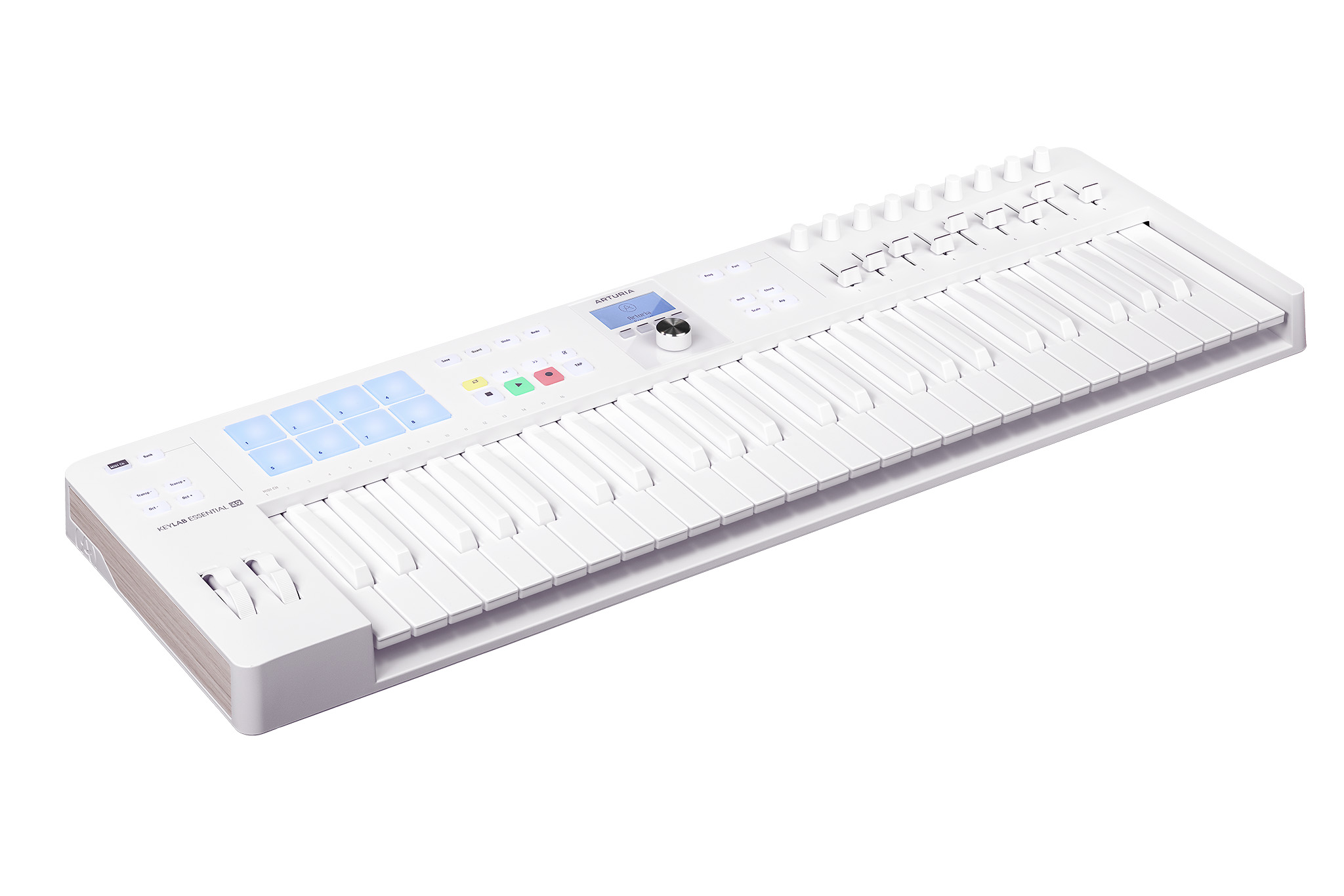Arturia KeyLab Essential 3 49 Alpine White è un controller MIDI in finitura Alpine White con tastiera full-size da 49 tasti (4 ottave), pensato per produzione in DAW e performance live: controlli dedicati (encoder, fader e pad RGB), display da 2,5′, integrazione avanzata con Analog Lab e script dedicati per le principali DAW, oltre a MIDI Out per controllare hardware esterni.