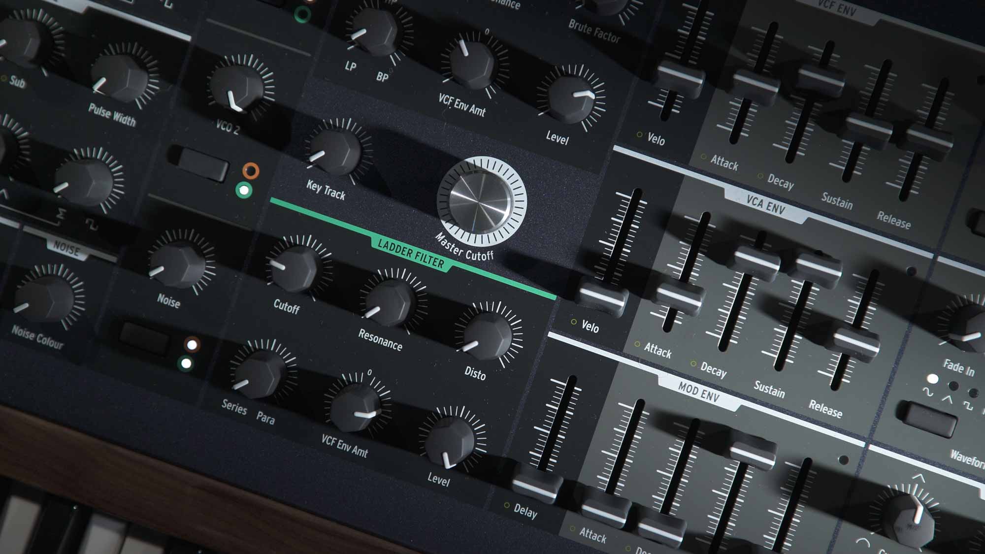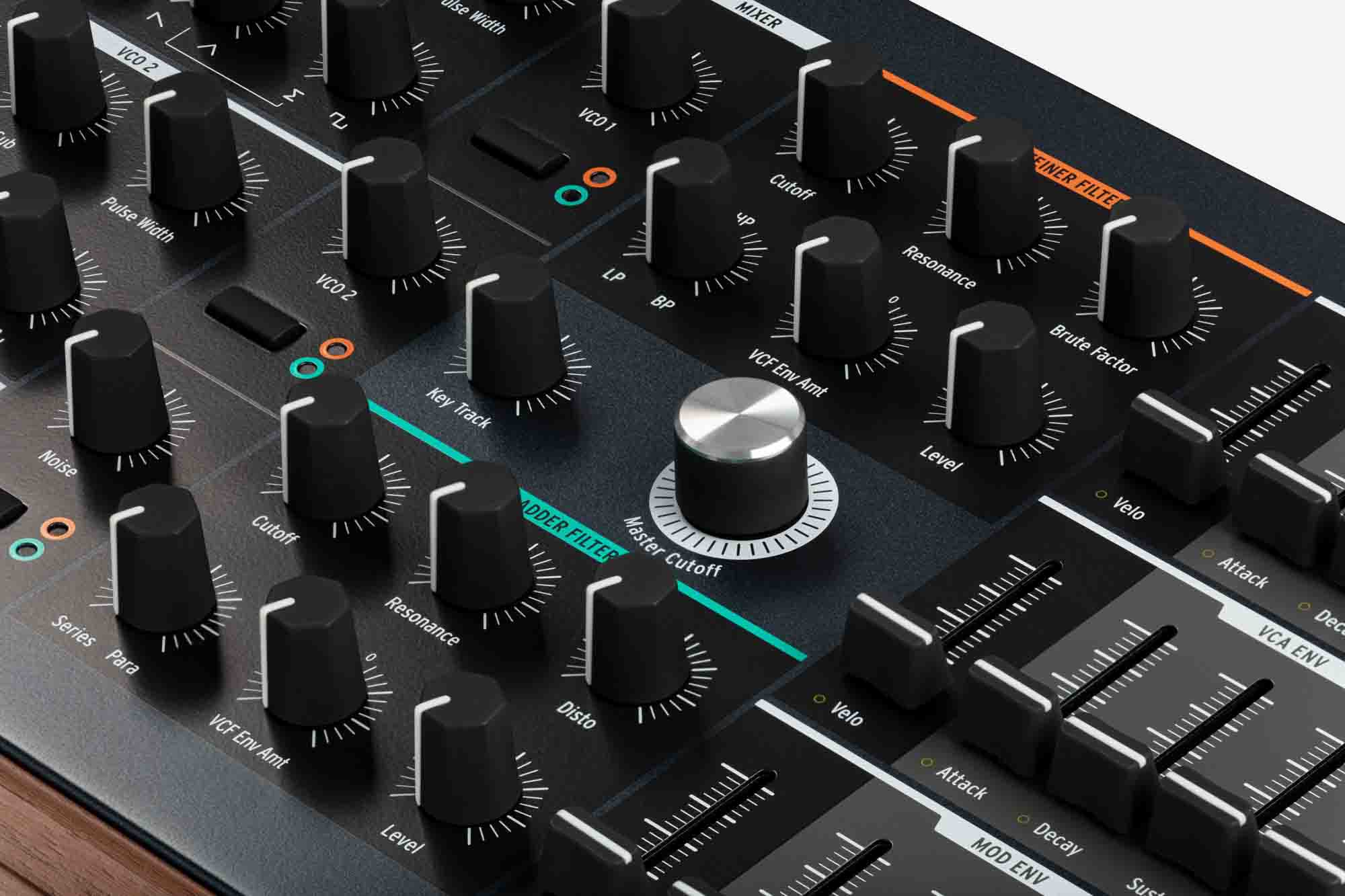 PolyBrute rappresenta l’evoluzione del linguaggio Brute di Arturia applicato a un vero polysynth analogico. Ogni voce è interamente analogica e integra due oscillatori Brute con waveshaping continuo, un generatore di rumore a spettro variabile e un sistema di doppio filtro composto da un Steiner multimode e da un filtro ladder low-pass a 24 dB. Questa architettura consente di coprire un’ampia gamma timbrica, dai suoni classici sottrattivi a texture complesse e dinamiche.