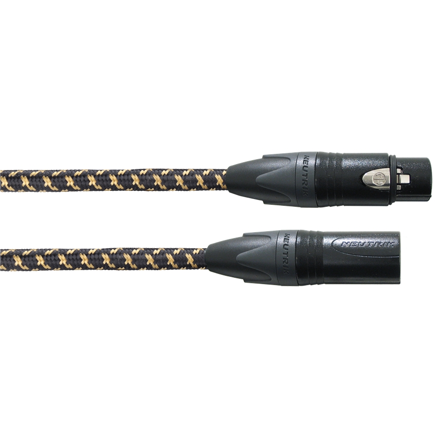 Cavo microfonico con connettori NEUTRIK: 1 XLR/M, 1 XLR/F. Il cavo è lungo 10m ed è rivestito di tessuto color nero/oro. I suoi connettori neri NEUTRIK® XLR con contatti placcati in oro sono anticorrosione e contribuiscono, oltre che a una durata eccezionale, ad un’elevata qualità di trasmissione del segnale.