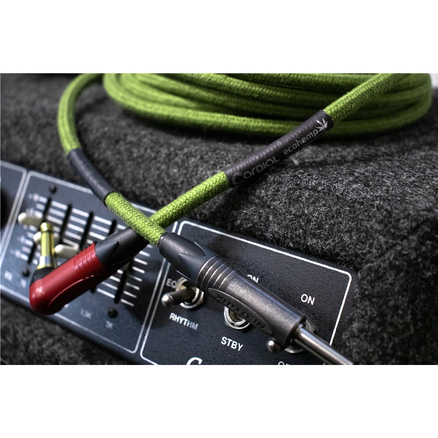 Cavo per strumenti musicali con 1 jack TS da 1/4′ maschio Neutrik e un connettore jack TS angolato da 1/4′ di tipo Silent Neutrik. Il cavo è lungo 3 metri e ha un rivestimento in canapa di colore verde. Cordial ha realizzato questo cavo senza l’utilizzo di materiale plastico e sostituendo al classico PVC il TPE-V, un materiale a base di fibre di canapa completamente riciclabile, elastico e resistente.