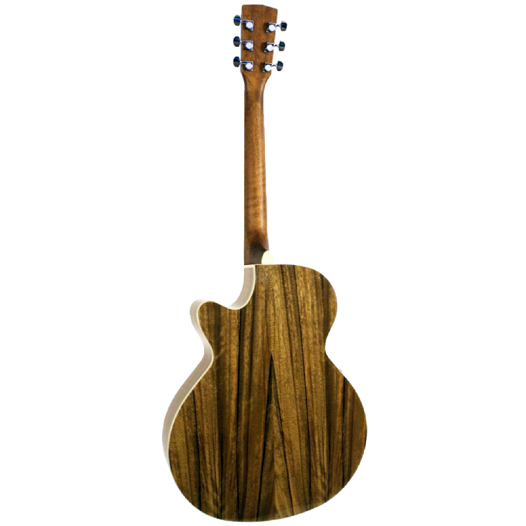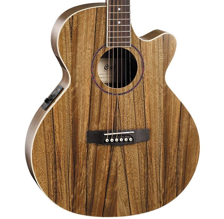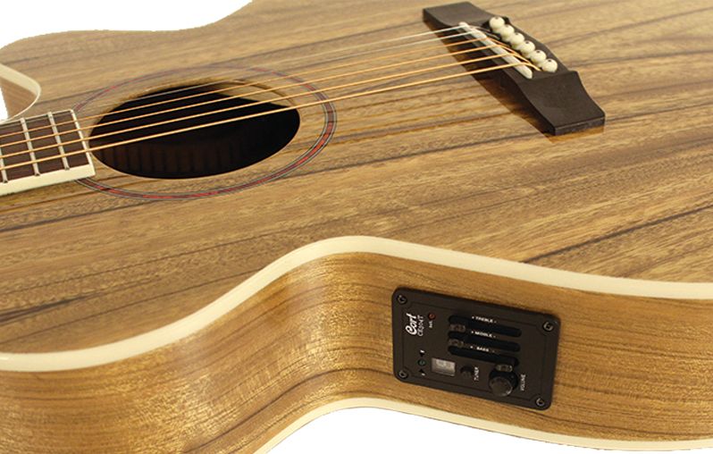 Chitarra acustica elettrificata con fasce strette da 83 mm. Tavola, fasce e fondo in Dao. Manico in mogano. Tastiera e ponte in palissandro. 20 tasti. Scala 25,3. Pickup in ceramica. Preamplificatore Cort CE304T. Finitura naturale lucida.