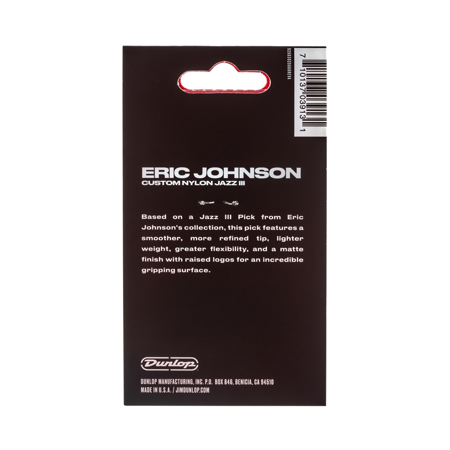 Per creare i plettri Eric Johnson Classic Jazz III, lo staff Dunlop ha scannerizzato un Jazz III storico della collezione personale di Eric e lo ha ricreato con le più avanzate tecniche disponibili. Il risultato è un Jazz III con una punta più rifinita e omogenea. il logo in rilievo sulla superficie garantisce un’incredibile presa.