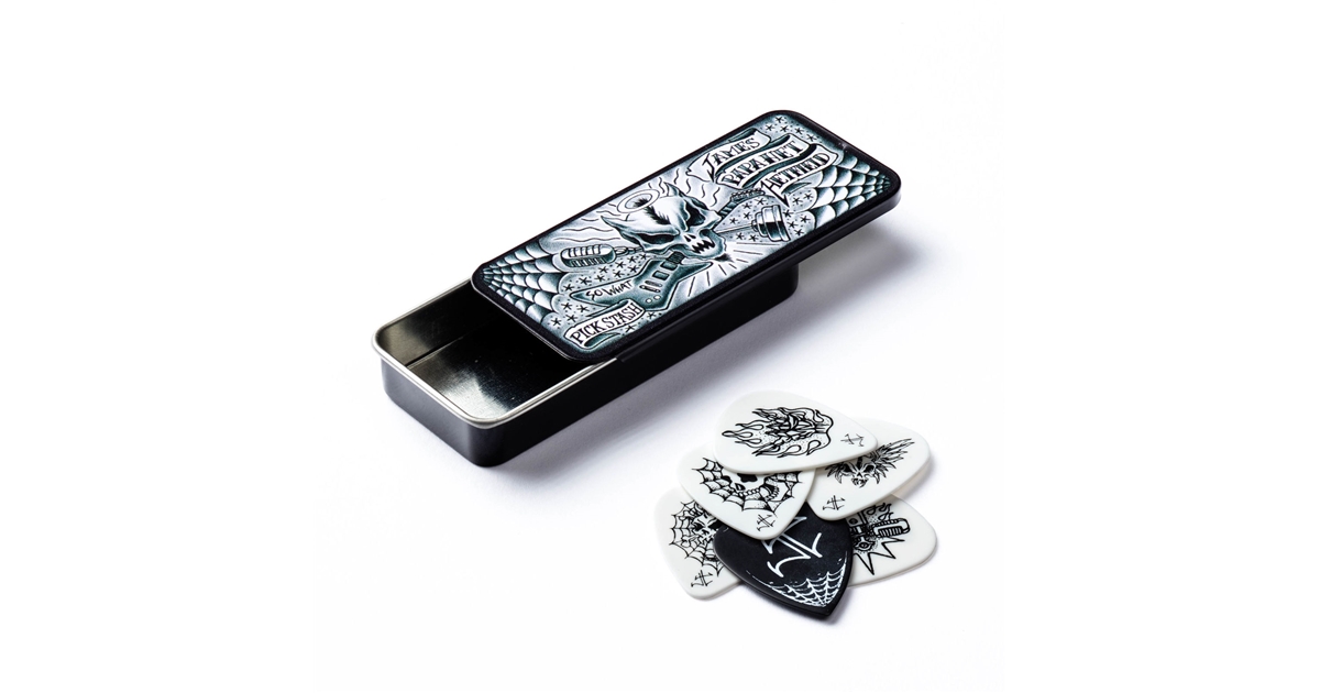 Tin Box contenente 6 plettri per chitarra elettrica James Hetfiled da collezione, di cui cinque plettri con illustrazione + 1 plettro originale del Tour.