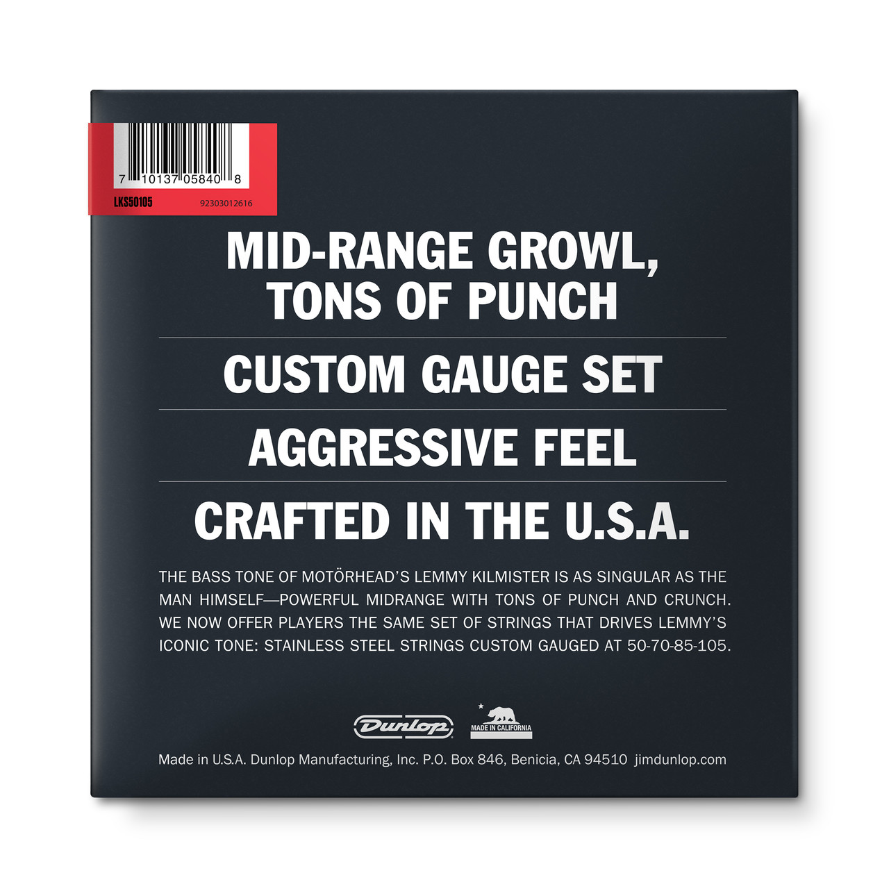 La sonorità del basso di Lemmy Kilmister dei Motörhead è singolare come lui stesso: medie potenti con tonnellate di ‘punch and crunch’. Dunlop offre ai musicisti lo stesso set di corde in acciaio inossidabile personalizzato che ha dato vita al tono iconico di Lemmy. Le corde per basso Dunlop offrono corde con medie taglienti e una gamma di basse ampia, in grado di adattarsi a stili tradizionali, allo slap o al rock. Il rivestimento è accuratamente studiato per ottenere corde bassa tensione con una lunga durata e un tempo di rodaggio minimo. Ogni set è bilanciato da corda a corda per offrire un’ampia gamma dinamica.