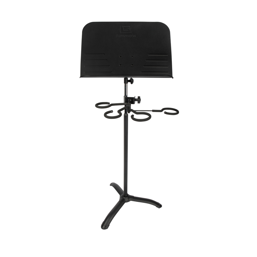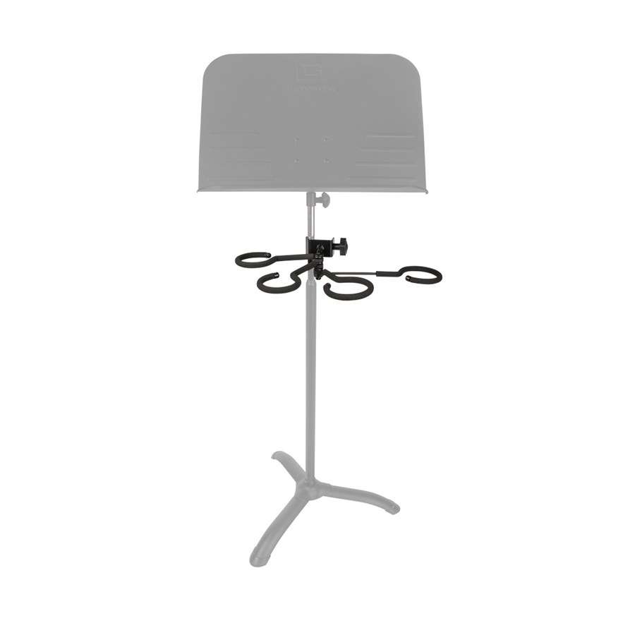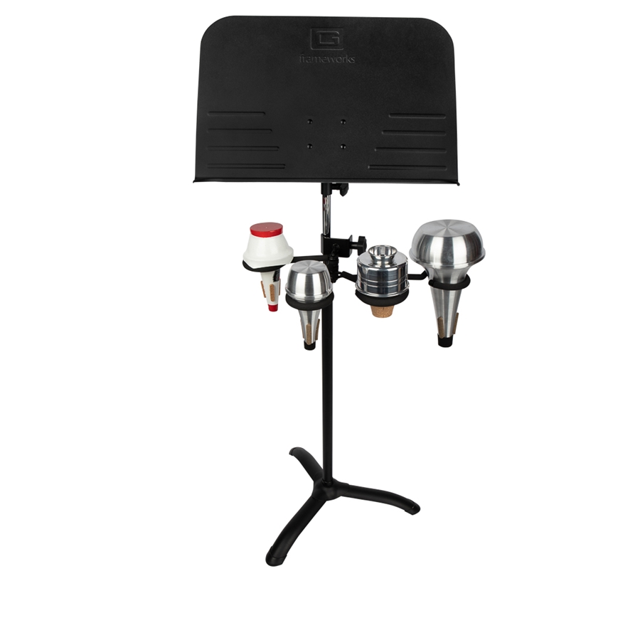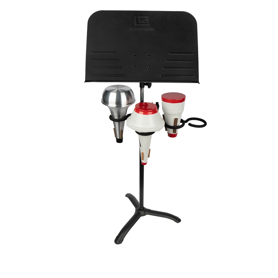 Grazie al suo sistema di fissaggio a morsetto, il supporto GFW-BNO-MUTEREST4 si applica facilmente al tubo di qualsiasi leggio musicale con diametro compreso tra 1,30 cm e 3,20 cm. Dispone di quattro anelli rivestiti in schiuma EVA antigraffio, due con diametro interno da 7,62 cm e due da 6,40 cm, per accogliere sordine di tromba, cornetta, trombone e corno francese. Gli anelli ruotano liberamente per adattarsi a qualsiasi configurazione. La struttura è pieghevole per ridurre l’ingombro e facilitarne il trasporto.