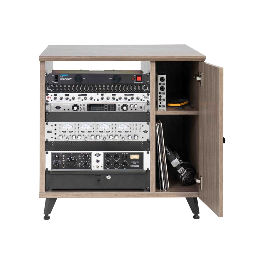 GFW-ELITEDESKRK-BRN è un rack studio 10U in noce scuro progettato per studi di registrazione e professionisti dell’audio che necessitano di un supporto versatile per preamplificatori ed effetti.