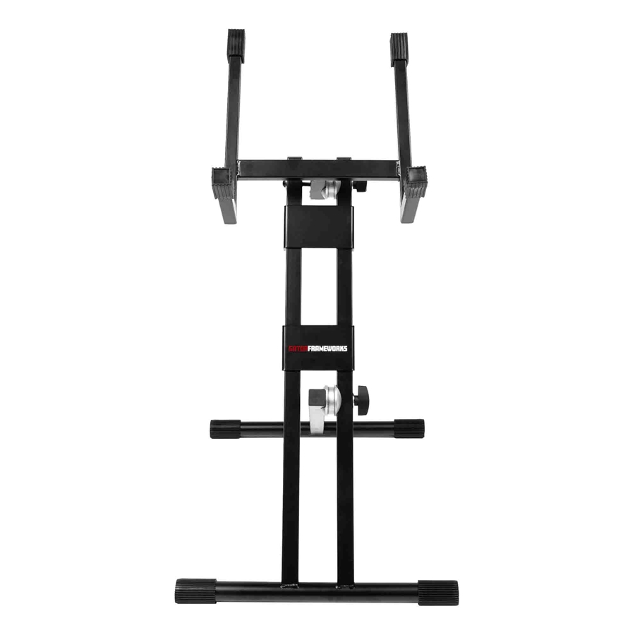 Il supporto GFWGTRAMP200 offre un’elevazione pratica per migliorare la proiezione sonora e facilitare l’accesso ai controlli di volume e tono. Progettato per amplificatori combo e testate full-size, è dotato di una struttura inclinabile con piedini e tappi in gomma per una stabilità ottimale. Il telaio superiore ruota e si blocca all’angolazione desiderata, mentre la base regolabile consente di personalizzare l’altezza per adattarsi a ogni esigenza. Grazie al design pieghevole, è facilmente trasportabile, ideale per musicisti in movimento.