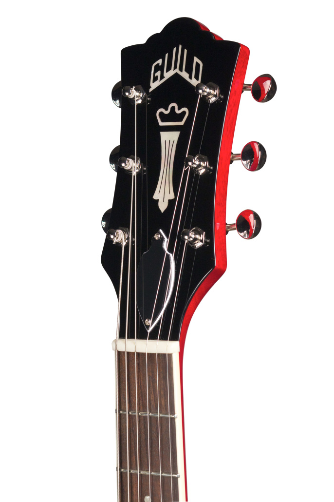 ‘Guild’s Starfire III è equipaggiata con dotazioni extra da grande chitarra nata per il rock ‘n’ roll, per chi cerca una combinazione tra look appariscente e straordinarie possibilità sonore. Hollow-body extra-Thin, single cutaway Florentine. Il grande ritorno di una chitarra rock tra le più amate nei primi anni ’60, con una grandissima personalità, la chitarra ha un corpo in mogano con tavola e fondo arcuati ( Arched) , il manico in mogano con profilo ”Soft U”, la tastiera in palissandro con Dot in madreperla, la scala della chitarra è di 629 mm, il nut di 43 mm. Il ponte è un tune -o-matic con base in palissandro abbinato ad un ponte vibrato progettato da Guild in alluminio Bigsby Style. I pickup sono gli LB-1 Little Bucker in ALNiCo 5 replica degli originali mini humbucking Guild. Questi pickup, hanno un suono che sta giusto a metà tra un humbucker e un mini-bucker . La finitura è poliuretanica lucida Cherry Red. Con custodia rigida TKL.’