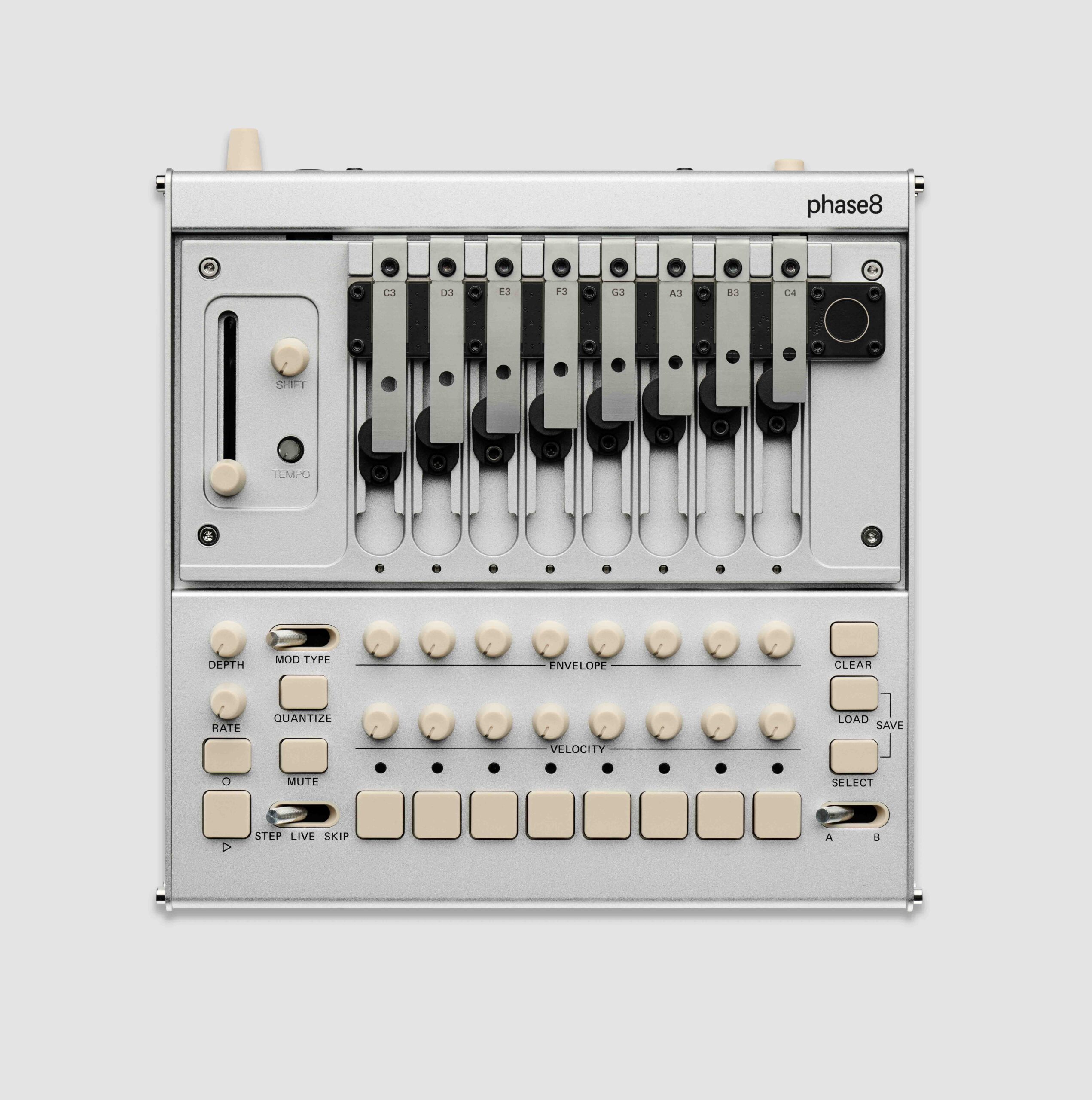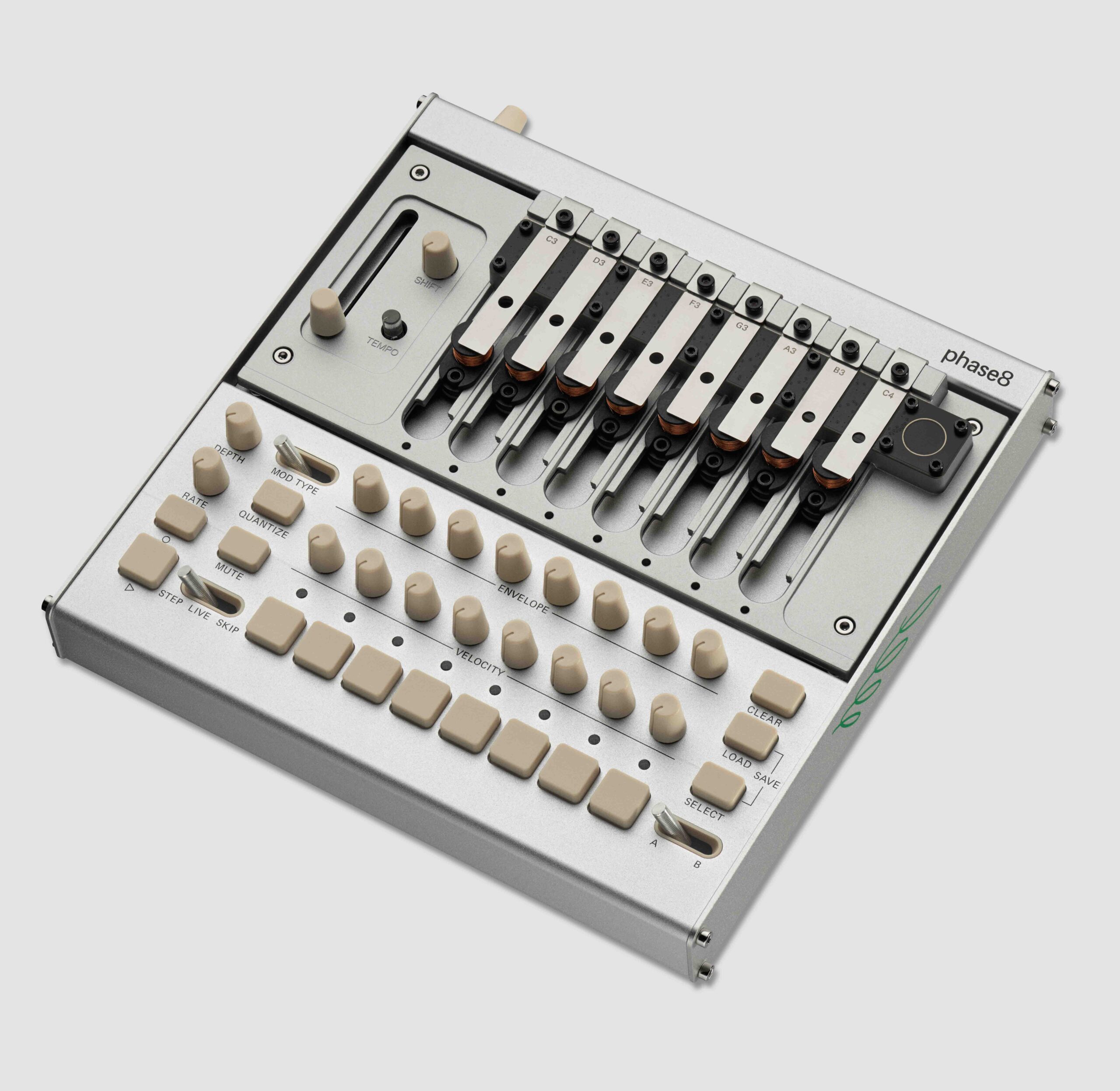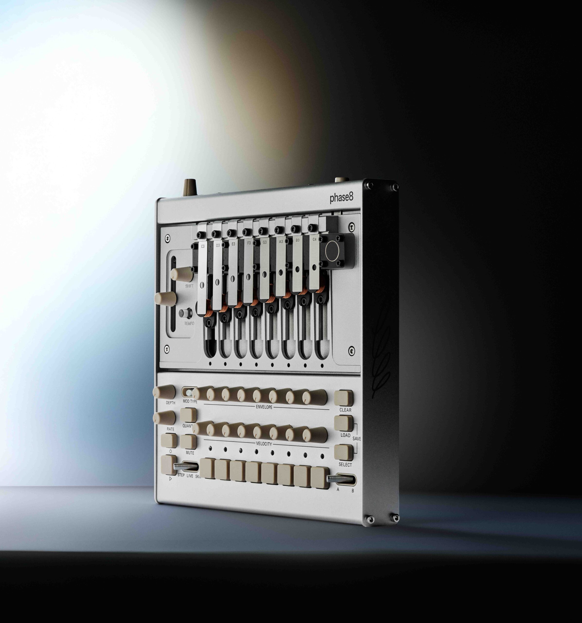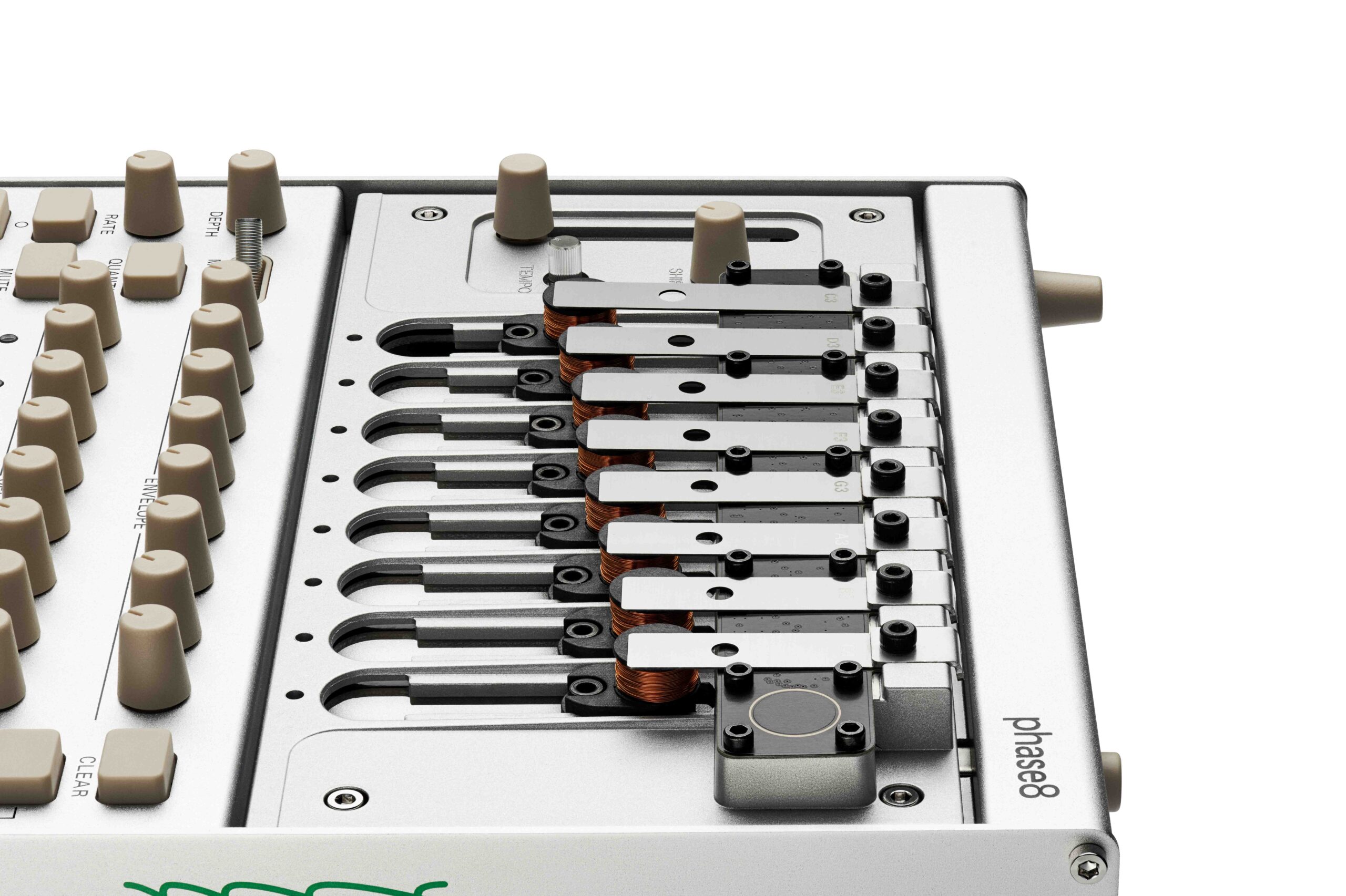 Phase8 include 13 risonatori in acciaio accordati cromaticamente, con la possibilità di installarne otto simultaneamente. I risonatori sono intercambiabili e regolabili, permettendo di definire scale personalizzate, risposte timbriche dedicate e caratteri sonori specifici. Questa architettura risulta particolarmente utile nella progettazione di set sonori coerenti per contesti live, installativi e di sound design.