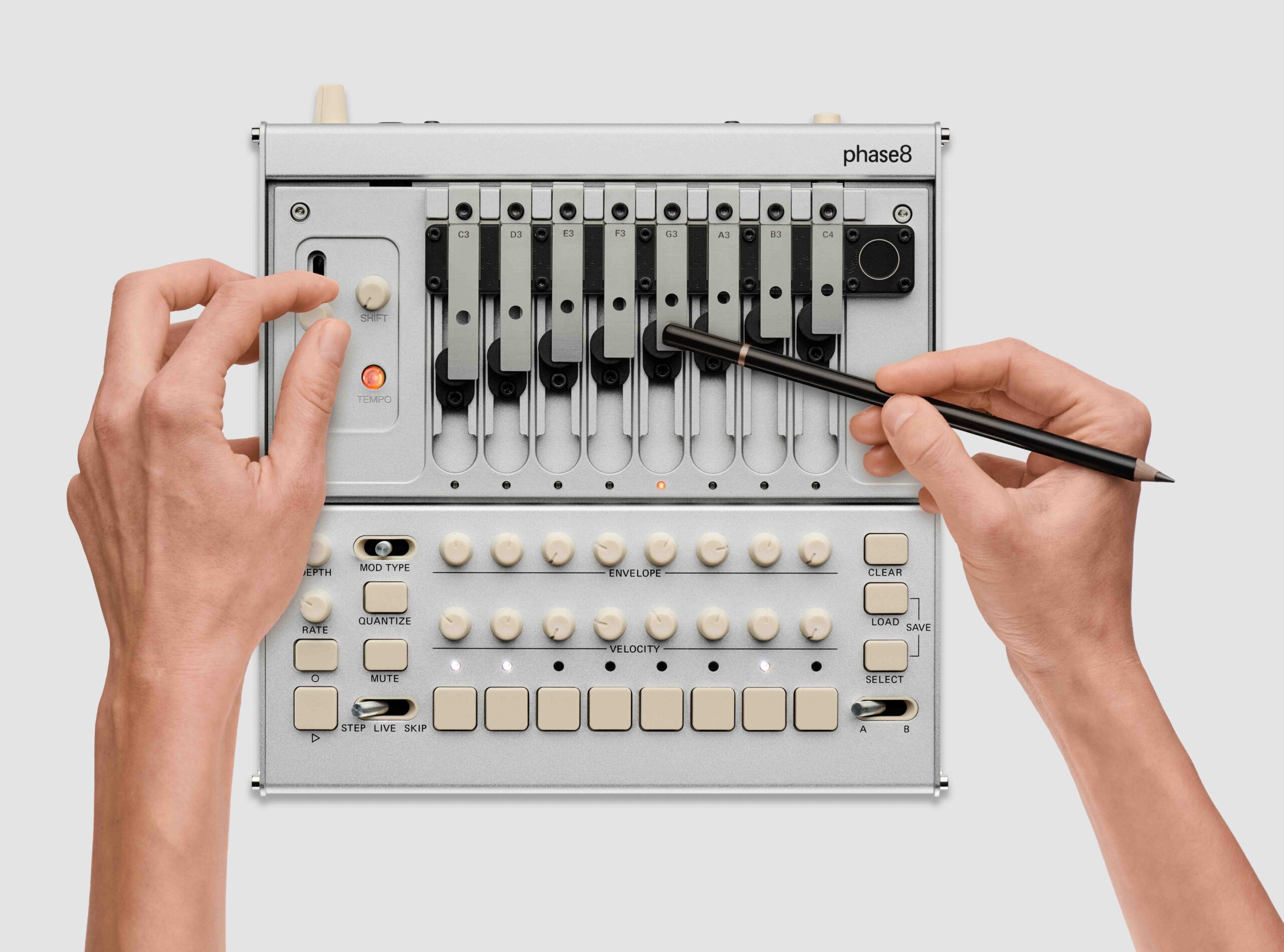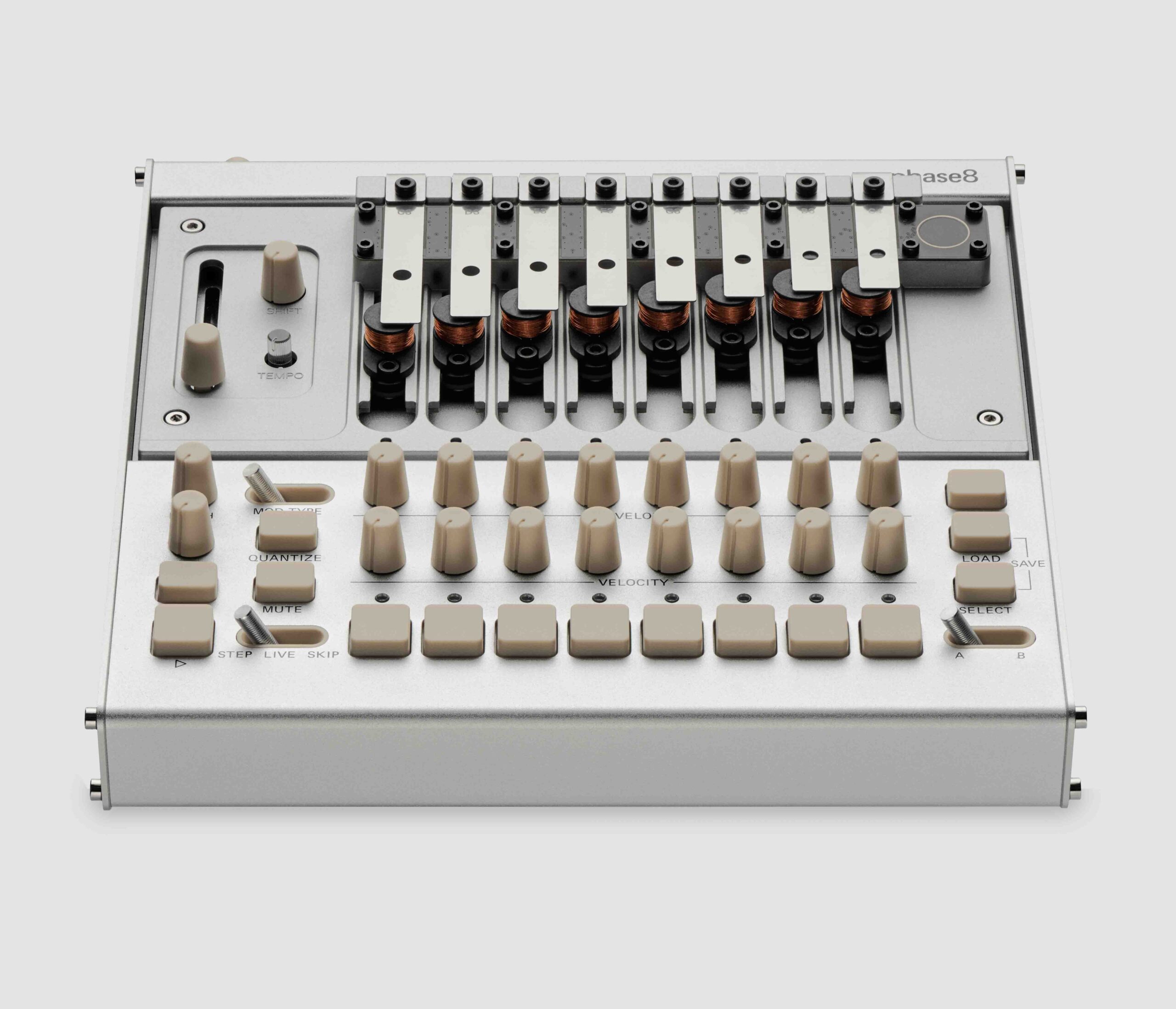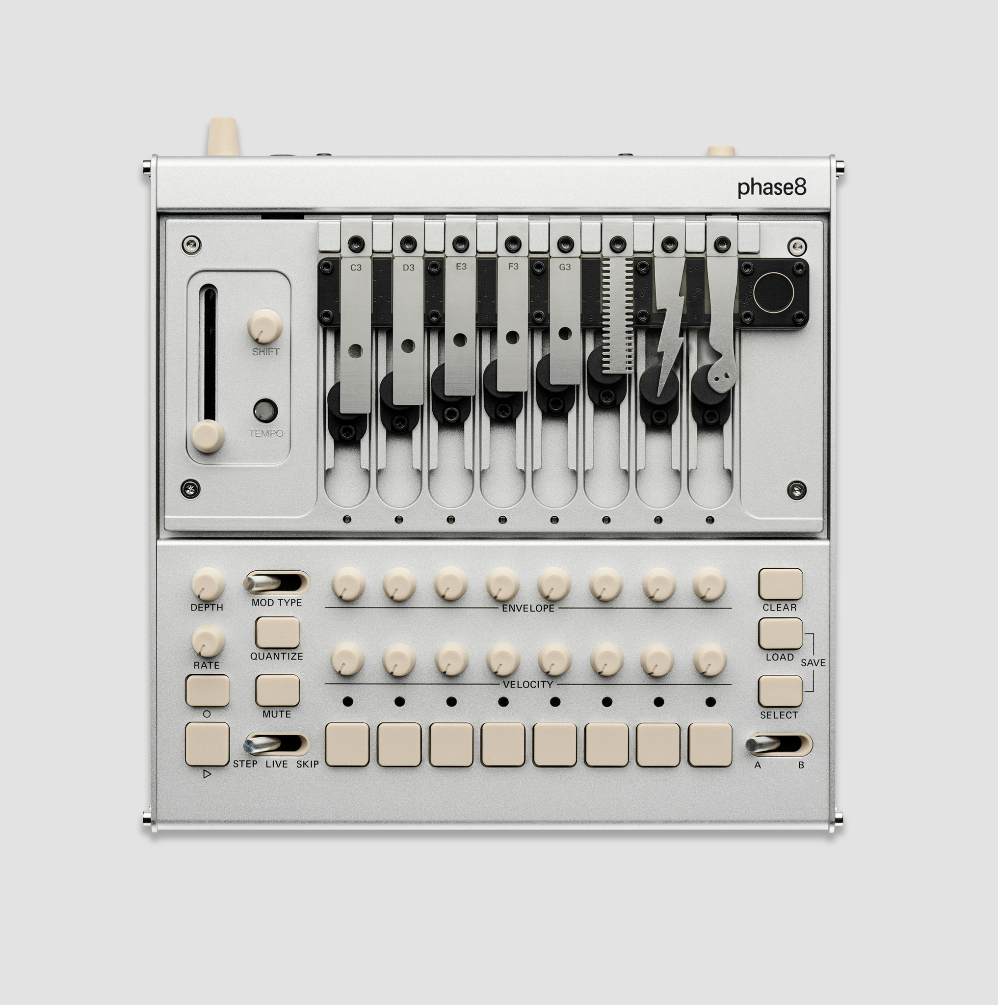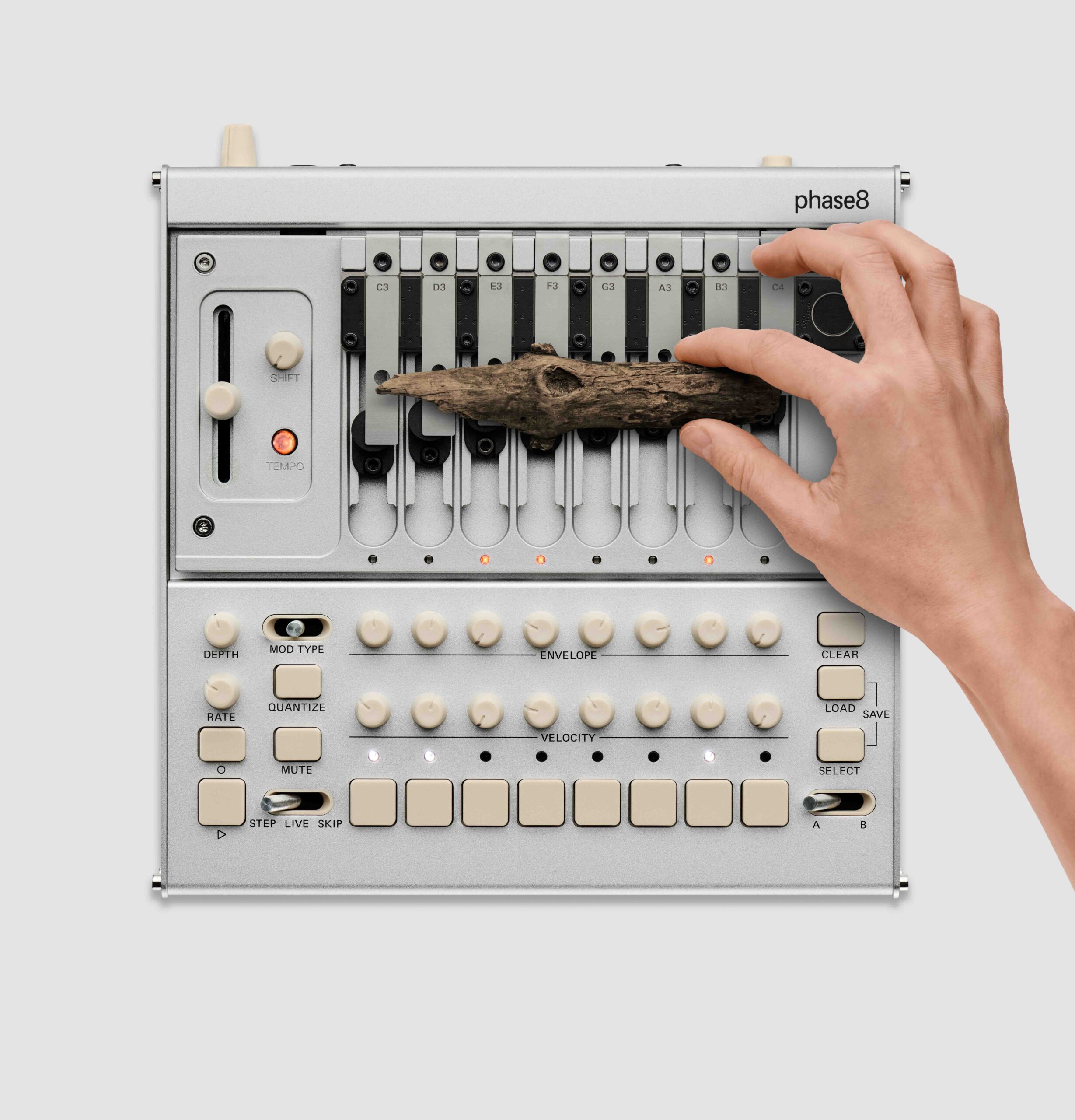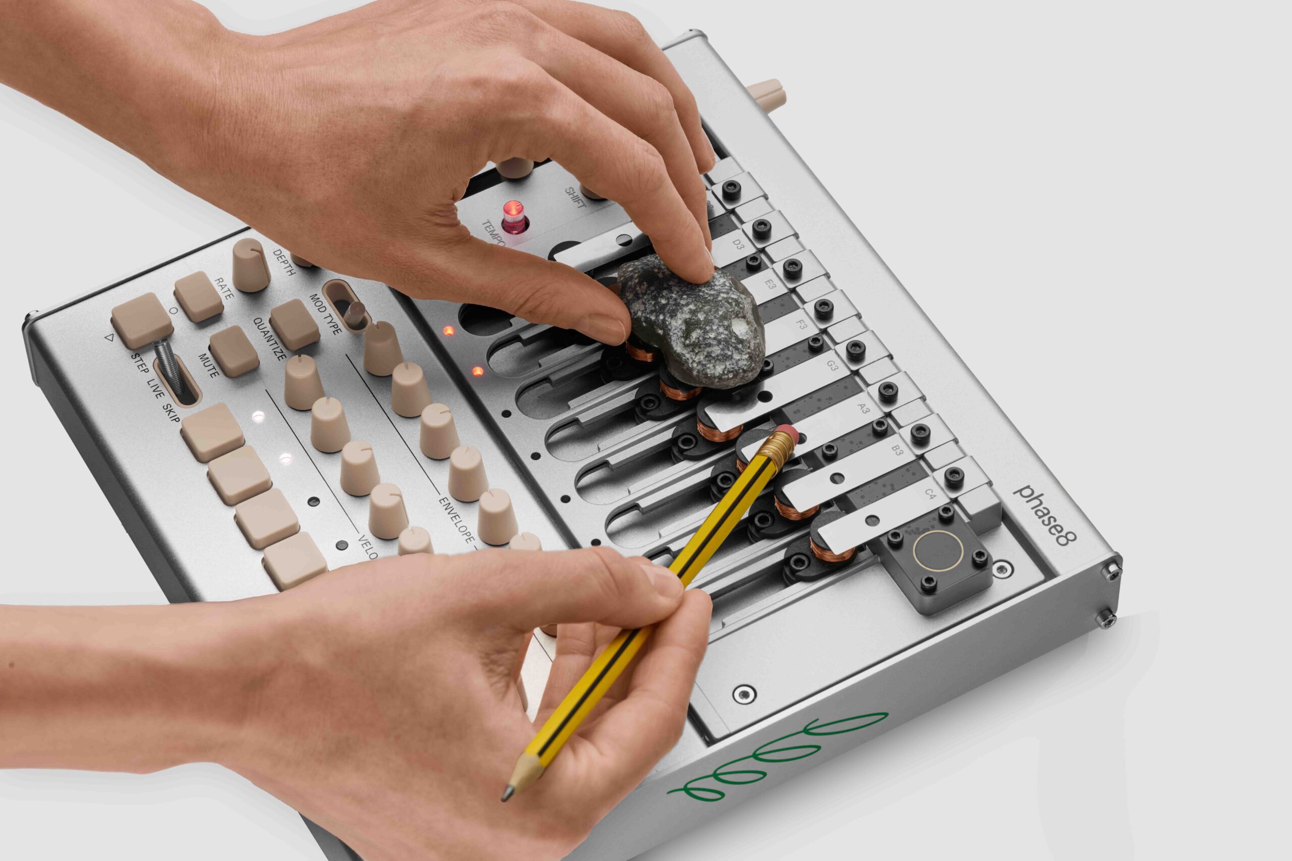 Phase8 include 13 risonatori in acciaio accordati cromaticamente, con la possibilità di installarne otto simultaneamente. I risonatori sono intercambiabili e regolabili, permettendo di definire scale personalizzate, risposte timbriche dedicate e caratteri sonori specifici. Questa architettura risulta particolarmente utile nella progettazione di set sonori coerenti per contesti live, installativi e di sound design.