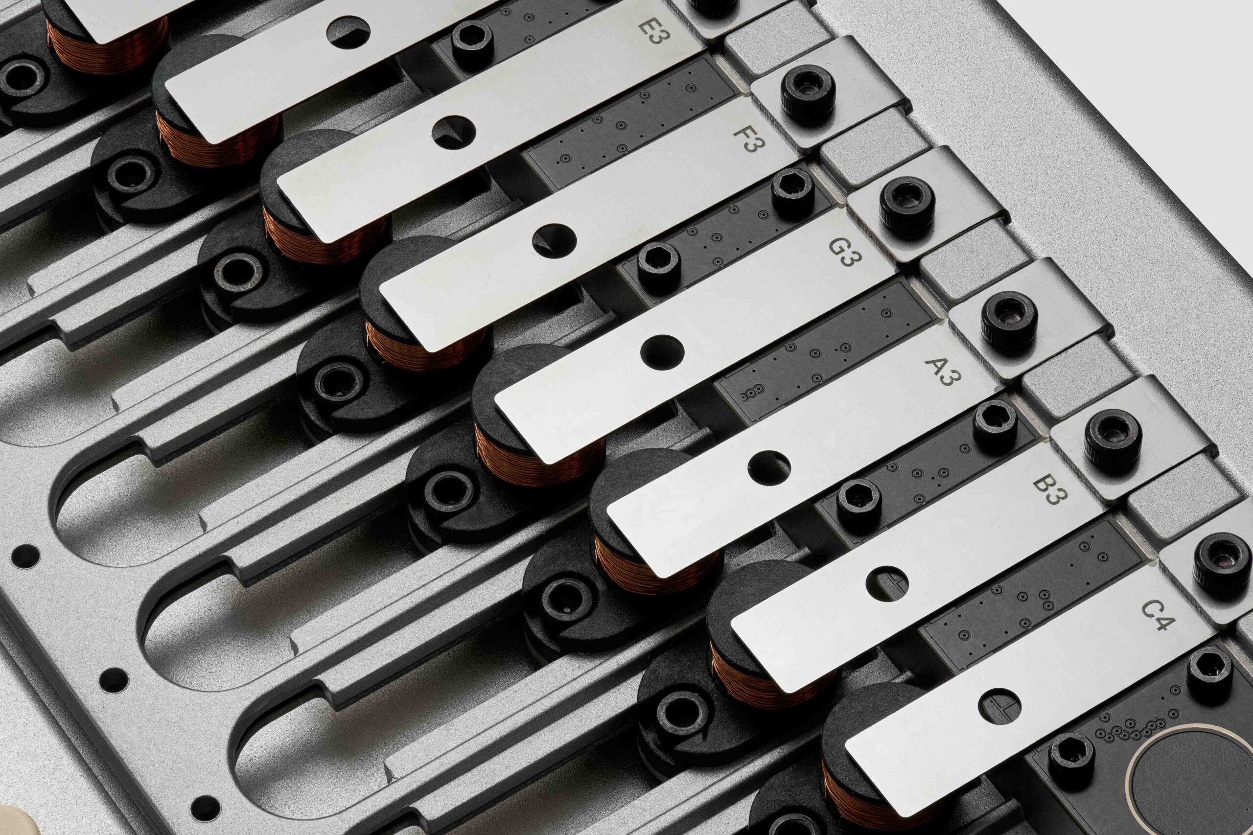 La Acoustic Synthesis utilizza vibrazioni fisiche reali come sorgente sonora. Le otto voci elettromeccaniche con risonatori in acciaio rispondono ai controlli del pannello, ma anche al contatto diretto, al feedback acustico e all’ambiente. Questo consente di modellare il suono attraverso il gesto, la pressione e l’interazione fisica, aprendo possibilità espressive particolarmente efficaci in performance e ricerca sonora.