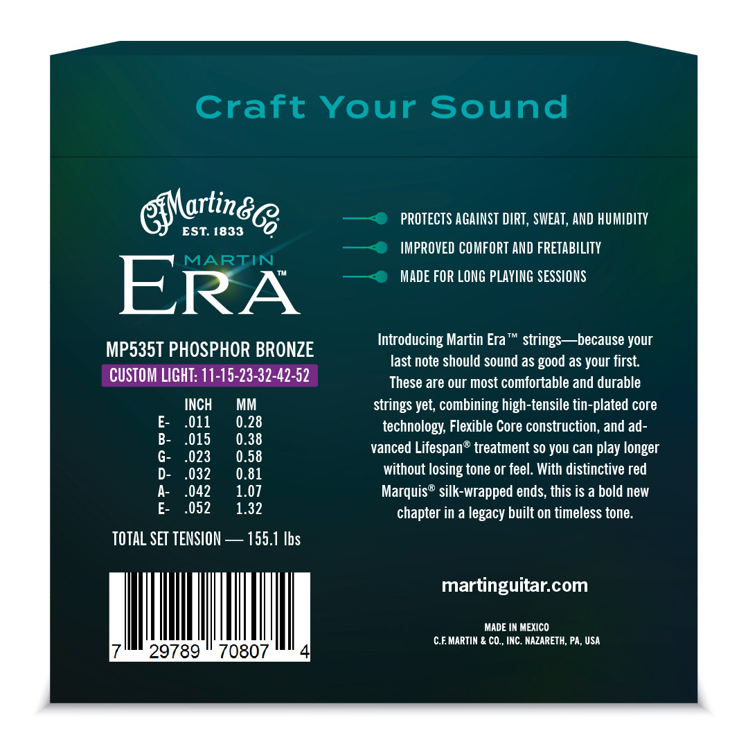 Progettate per offrire tono e suonabilità senza compromessi, le corde Martin Era™ stabiliscono un nuovo standard per le corde acustiche in phosphore-bronze. Frutto della combinazione delle migliori tecnologie della gamma Martin Strings, le Martin Era sono dotate del trattamento brevettato Lifespan®, che protegge dalla corrosione, della costruzione Flexible Core, pensata per migliorare la comodità sotto le dita e la facilità di esecuzione, e delle estremità ball end rivestite in seta: un dettaglio premium ispirato agli strumenti vintage e simbolo della lunga tradizione artigianale Martin nella produzione di corde.