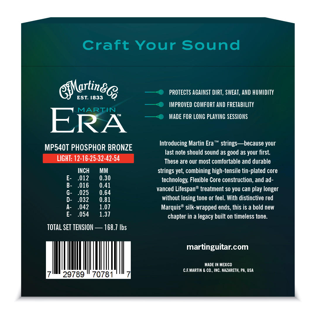 MP540T ERA 12-54 Light è il set di corde per chitarra acustica phosphore bronze della serie ‘Luxe’ di Martin & Co, con scalatura 12-54. Le corde ERA si contraddistinguono per il trattamento brevettato Lifespan®,l’anima Flexible Core e i ball end rivestiti in seta.