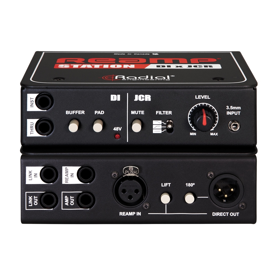Una sessione di Reamping deve inizia con una registrazione diretta pulita e di alta qualità: ecco perché la DI scelta è così importante. La parte attiva della DI di Reamp® Station è basata sul rinomato J48 di Radial, ottimizzato per fornire il massimo beneficio nella registrazione di tracce che potranno essere successivamente sottoposte a Reamping, come per esempio l’interruttore del buffer, che attiva un circuito in classe A a guadagno unitario sull’uscita Thru, che evita di caricare i pickup passivi quando sono collegati a un amplificatore, preservando il timbro naturale dello strumento. Il circuito della DI è alimentato tramite phantom a 48 V dall’interfaccia o dal mixer, quindi non è quindi necessario un alimentatore separato, mentre un LED sul pannello frontale visualizza la ricezione dell’alimentazione.