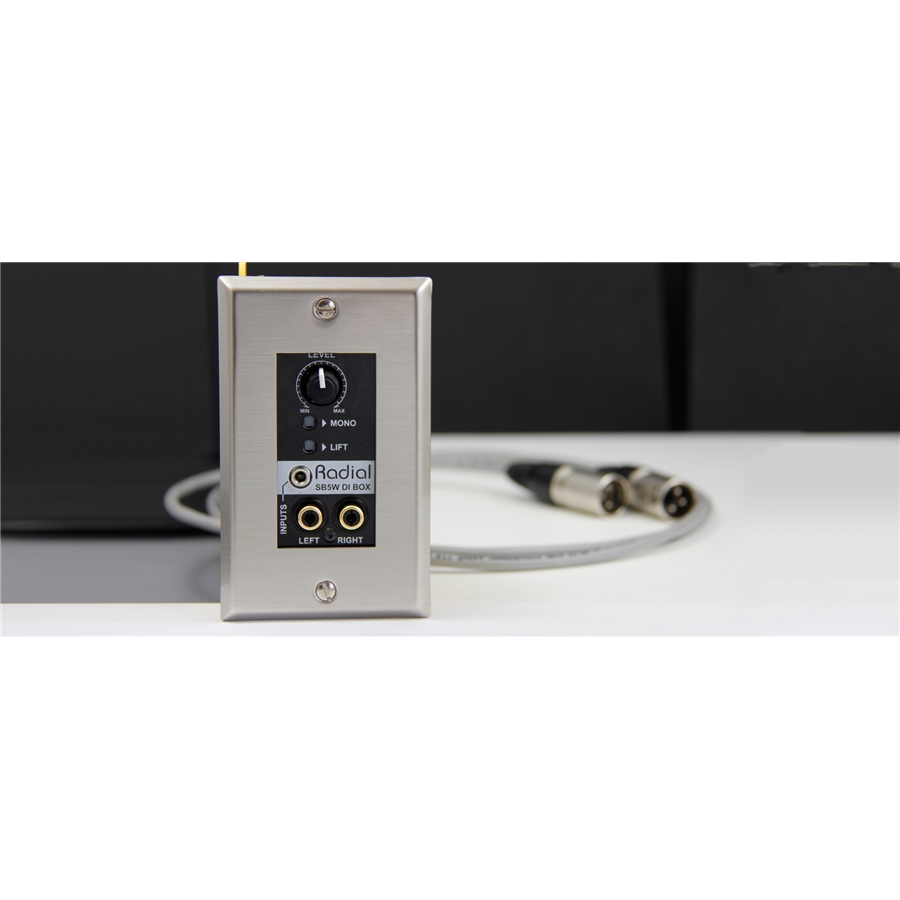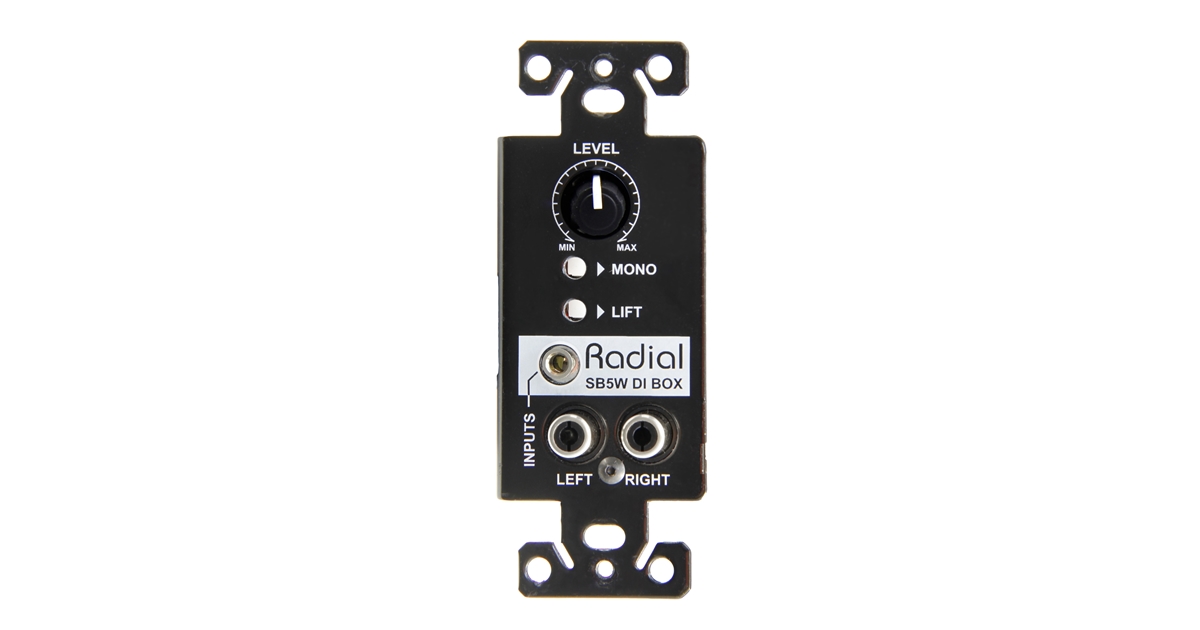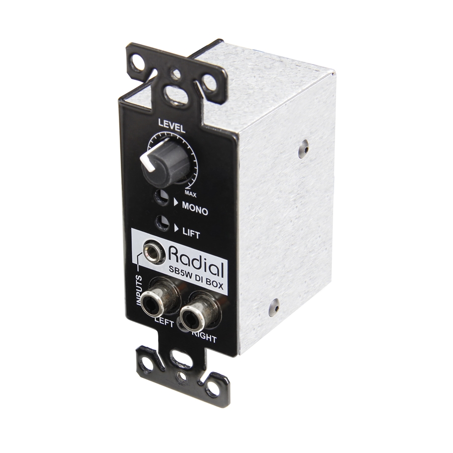 Radial SB5W è una DI box stereo progettata per l’installazione in una comune scatola elettrica a singola gang, offrendo agli integratori AV una soluzione semplice ed efficace per collegare sorgenti audio come laptop, smartphone o tablet, a un sistema di amplificazione. Essendo completamente passiva, non richiede alcuna alimentazione: basta collegare le uscite tramite un normale cavo audio bilanciato a coppie twistate verso l’ingresso microfonico del PA ed è subito operativa. La presenza di ingressi mini jack TRS da 3,5 mm e RCA facilita il collegamento di qualsiasi dispositivo consumer, mentre il controllo di livello permette di adattare rapidamente il segnale. Quando i canali disponibili sono limitati, lo switch di somma mono consente di unire i due ingressi in un’unica uscita. Per eliminare ronzii e interferenze, la SB5W utilizza trasformatori di isolamento che interrompono i loop di massa, supportati da un interruttore ground lift incassato. Il robusto chassis in acciaio protegge l’elettronica e riduce l’induzione elettromagnetica, mentre gli appositi slot per fascette assicurano un fissaggio stabile dei connettori a vite.