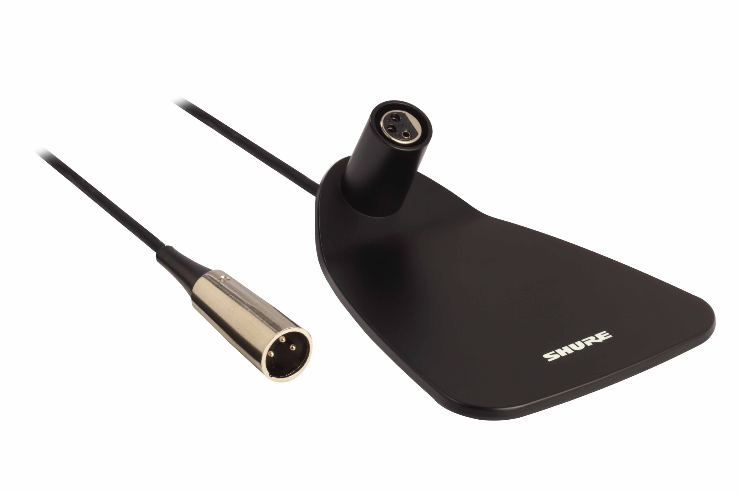 Base da tavolo di colore nero per i microfoni a collo d’oca Centraverse da 12” e da 18”. Cavo fisso da 3 Metri. Connettori XLR.