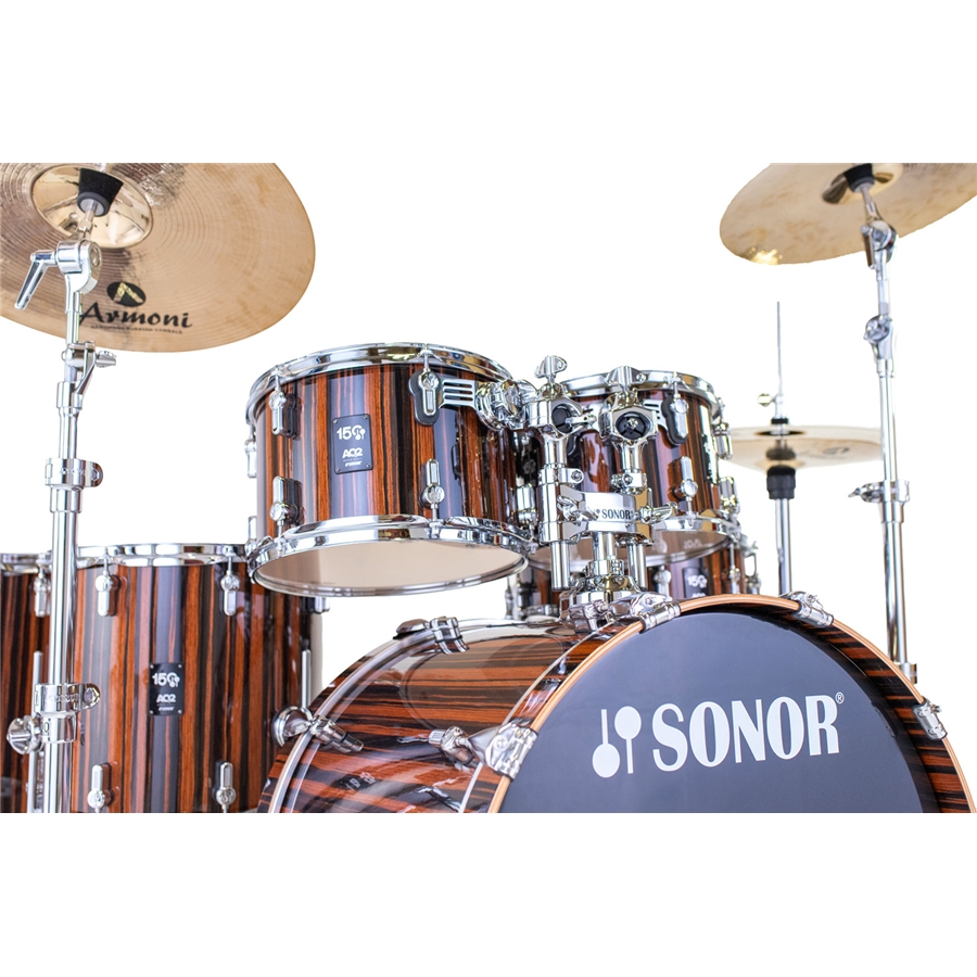 Basato sulla serie AQ2 standard, questo set presenta fusti al 100% in acero, realizzati con una combinazione di acero nordamericano e acero cinese. L’impiallacciatura esterna replica l’ebano ed è applicata anche sui cerchi della grancassa. Come su tutti i modelli SONOR di fascia alta, l’impiallacciatura è posizionata in verticale e rifinita con una vernice trasparente lucida.