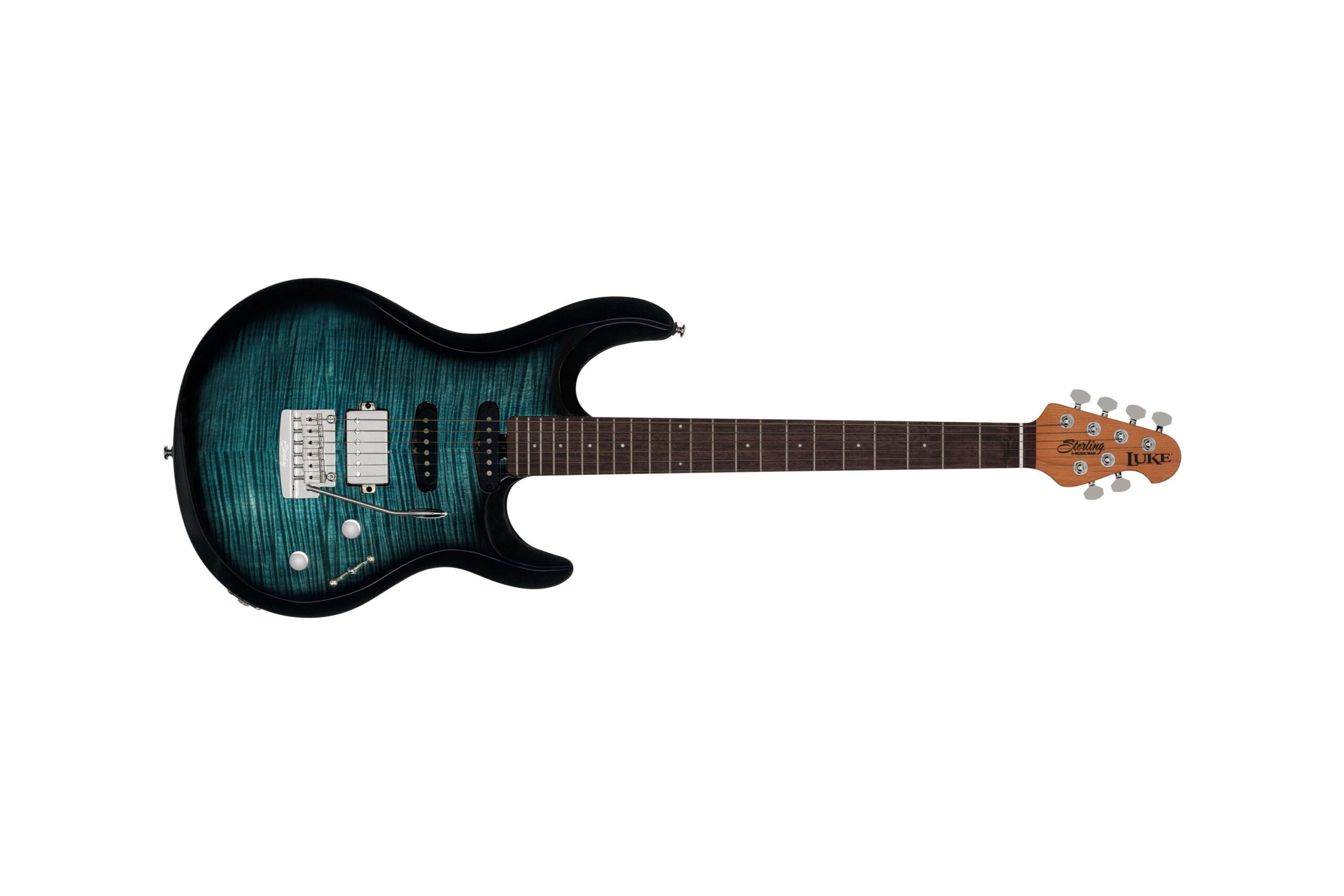 La Luke LK100 HSS Yucatan Blue è la chitarra elettrica della serie ‘Luke’ di Sterling by Music Man, progettata in collaborazione con il chitarrista Steve Lukather. È realizzata con corpo in Nyatoh, top in Acero fiammato impiallacciato, manico in Acero roasted e tastiera 22 tasti in Palissandro. Presenta la configurazione di pickup H-S-S, con due single-coil Alnico V e un humbucker ceramico, switch a 5 vie e controlli di volume e tono con un push/push sul volume per un boost di 12db.